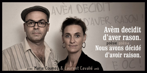 Marie Coumes et Laurent Cavalié ont construit une veillée pour redonner les paroles des anciens militants ainsi que leur regard sur ce combat. Ils souhaitent rendre la fierté à ces événements, dont la fin tragique, avec les deux morts de Montredon, éclipsa la grandeur et la valeur de l’engagement. Aussi, depuis qu’ils tournent ce spectacle, les langues se délient. Les anciens se mettent à parler, à raconter leur vision, leurs souvenirs, leurs rêves et leur bilan. Dans cette veillée, nous disons des pépites de la poésie occitane de ces 50 dernières années. Un fil conducteur : les poètes de la décolonisation. Deux ans de lecture, de recherche sur la façon de dire cette poésie aujourd’hui, de la mettre en musique, croiser les deux langues, croiser le politique et notre rapport intime à la langue occitane. Une forme simple qui oublie la scène et l’idée même de spectacle… Et nous voici prêts à passer un moment tranquille en votre compagnie, que vous parliez la langue ou pas.