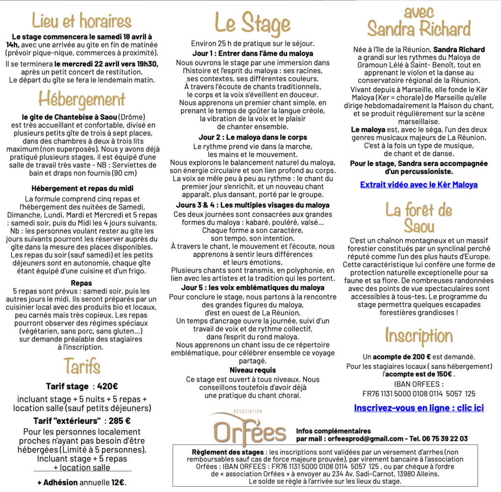 Du 18 au 22 avril, Robert Nageli fidèle complice et ami invite Sandra Richard, artiste musicienne, pour un stage de Maloya à Chantebise (ça ne s’invente pas !) dans la Drôme
