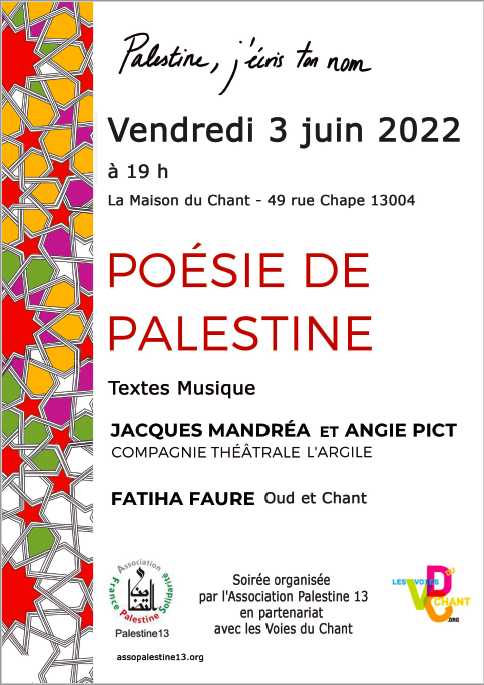 Pour nous faire partager des poèmes de Fadwa Touqan, de Fayad Ashraf, de Mahmoud Darwich, de Samih Al Qâssim,de Nathalie Abou Shakra,